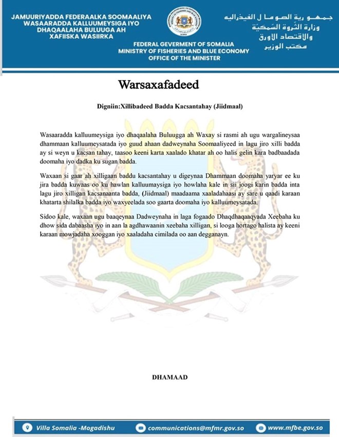 War saxaafadeed kasoo baxay Wasaaradda kalluumeysiga iyo dhaqaalaha Buluugga ah Waxay si rasmi ah ugu wargalisay dhammaan kalluumeysatada iyo guud ahaan dadweynaha Soomaaliyeed in lagu jiro xilli badda ay si weyn u kacsan tahay, taasoo keeni karta xaalado khatar ah oo halis gelin kara badbaadada doomaha iyo dadka ku sugan badda.