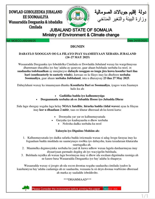 War qoraal ah oo kasoo baxay Wasaaradda degaanka ee Dowlad Goboleedka Jubaland ayaa lagu sheegay Digniintaan ah in dabaylahaasi ay noqon karaan kuwo sababa khasaare hantiyadeed iyo mid nafeed haddii aan taxadar la muujin.