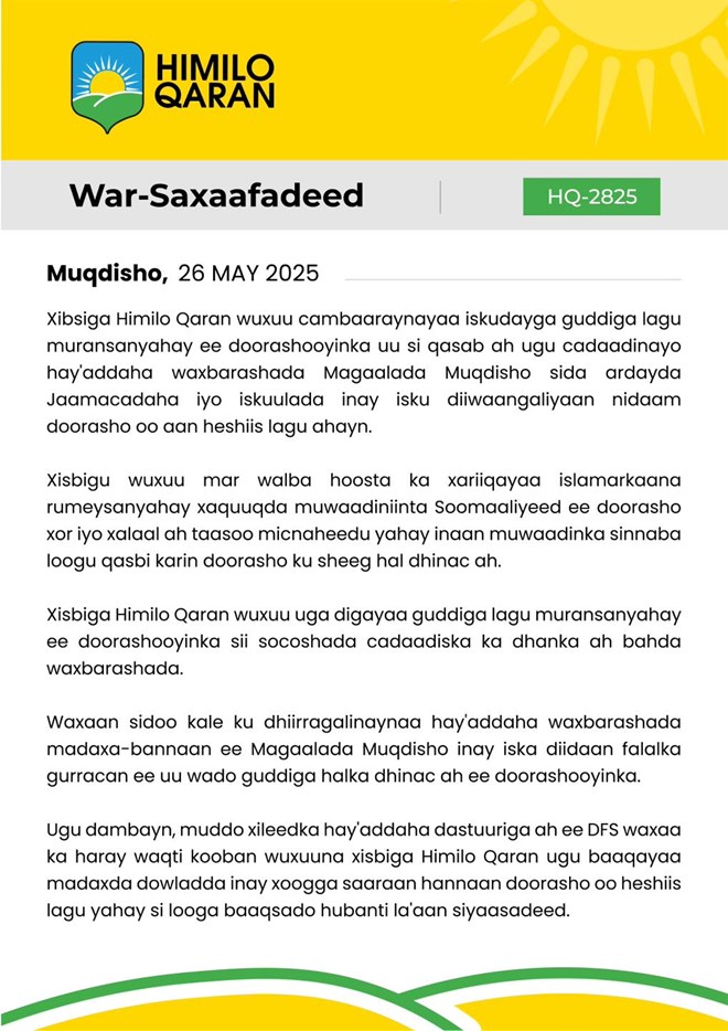 Isniin, May 26, 2025 (HOL) – Xibsiga Himilo Qaran ayaa sheegay inay sikulul u cambaaraynayaan iskuday ay ku sheegeen in guddiga doorashooyinka uu si qasab ah ugu cadaadinayo hay’addaha waxbarashada Magaalada Muqdisho sida ardayda Jaamacadaha iyo iskuulada inay isku diiwaangaliyaan nidaam doorasho oo aan heshiis lagu ahayn.