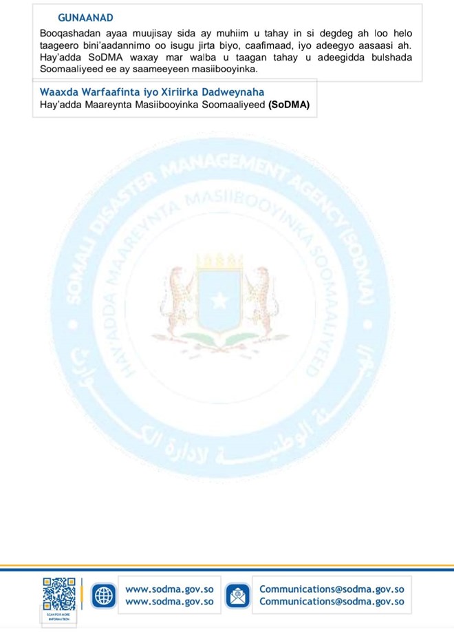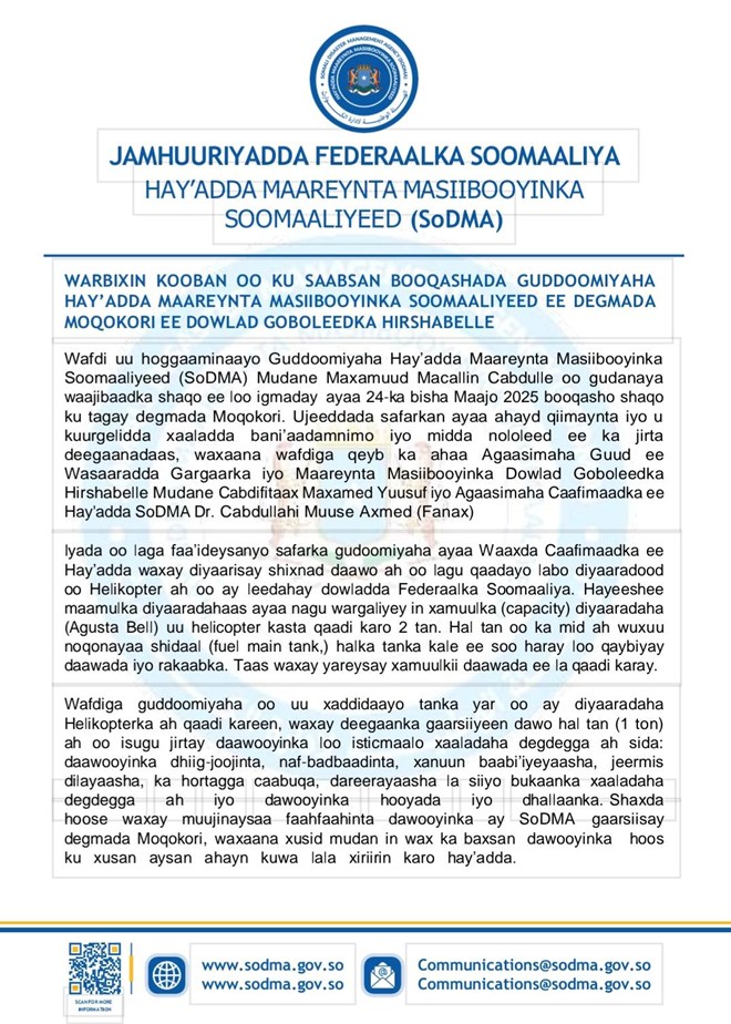 Waxaa sidoo kale SODMA ay sheegtay in degmada Moqokori ee gobolka Hiiraan iney ka jirto xaalad bani’aadanimo, islamarkaana ay qorsheyneyso sidii wax looga qaban lahaa xaaladaha bani’aadanimo iyo mida nololeed ee ka jirta Moqokori.