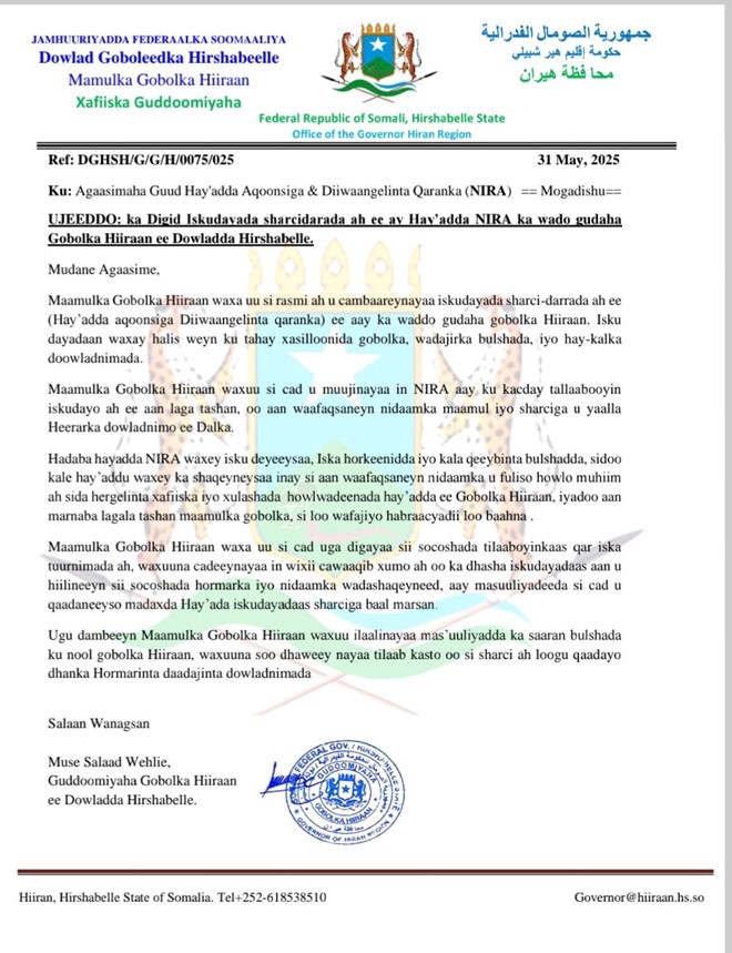 “Maamulka Gobolka Hiiraan waxuu si cad u muujinayaa in (NIRA) aay ku kacday tallaabooyin iskudayo ah ee aan laga tashan, oo aan waafaqsaneyn nidaamka maamul iyo sharciga u yaalla Heerarka dowladnimo ee Dalka” ayaa lagu yiri Warsaxafadeedka kasoo baxay maamulka gobolka Hiiraan.