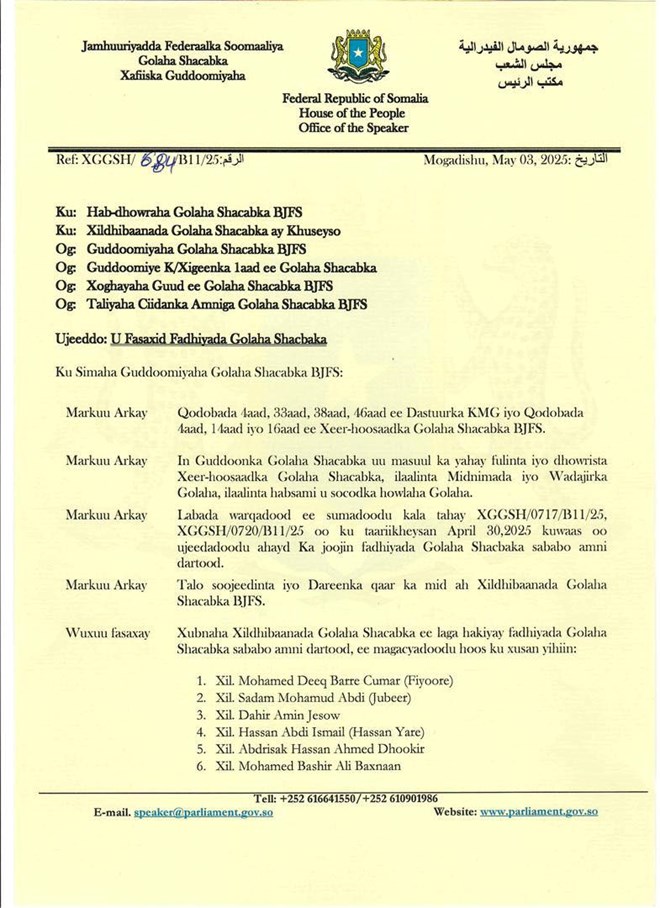 “Markuu Arkay Labada warqadood ee sumadoodu kala tahay XGGSH/0717/B11/25, XGGSH/0720/B11/25 kuwaas oo ujeedadoodu ahayd Ka joojin fadhiyada Golaha Shacbaka sababo amni dartood iyo Talo soojeedinta iyo Dareenka qaar ka mid ah Xildhibaanada Golaha Shacabka Wuxuu fasaxay Xubnaha Xildhibaanada Golaha Shacabka ee laga hakiyay fadhiyada Golaha Shacabka” ayaa lagu yiri qoraalka Warqada.