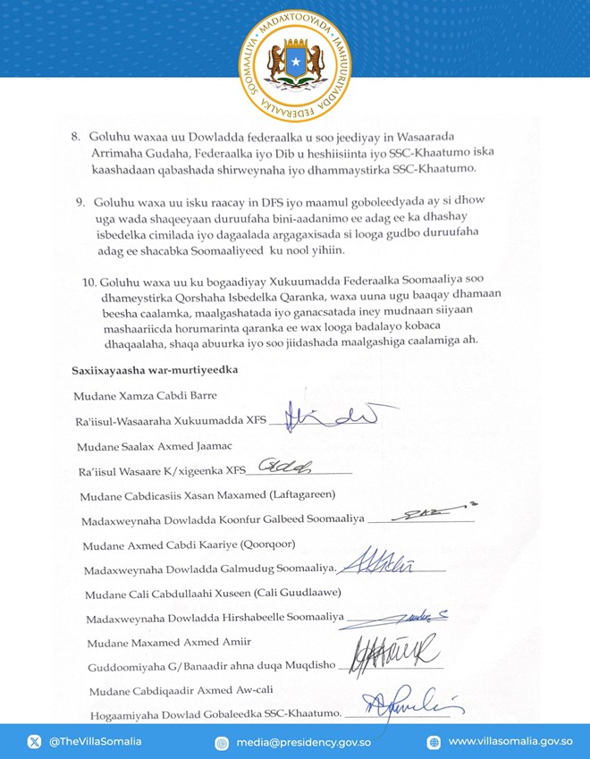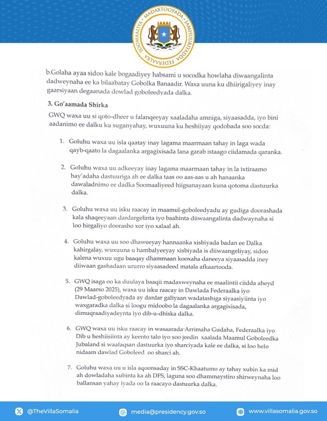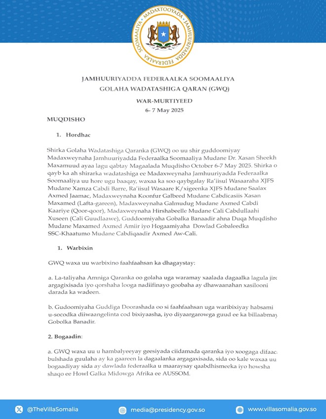 Arbaco, May 7, 2025 (HOL) – Golaha Wadatashiga Qaran ayaa caawa war-murtiyeed ka soo saaray shirkoodii uga socday magaalada Muqdisho, iyagoo ku gaaray isfaham siyaasadeed iyo wadashaqeyn ku aaddan arrimaha amniga iyo hannaanka doorashooyinka dalka.