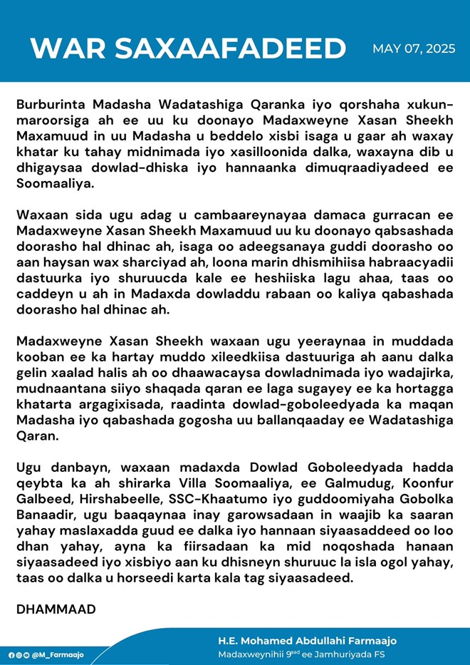 Waxa uu ugu baaqay Madaxweyne Xasan Sheekh in muddada kooban ee ka hartay muddo xileedkiisa dastuuriga ah aanu dalka gelin xaalad halis ah oo dhaawacaysa dowladnimada iyo wadajirka, mudnaantana siiyo shaqada qaran ee laga sugayey ee ka hortagga khatarta argagixisada, raadinta dowlad-goboleedyada ka maqan Madasha iyo qabashada gogosha uu ballanqaaday ee Wadatashiga Qaran.