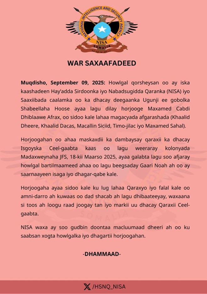 Arbaco, September 10, 2025 (HOL) – Warsaxaafadeed ka soo baxay hay’adda Nabadsugida iyo Sirdoonka Qaranka ee NISA ayaa lagu sheegay in howlgal qorsheysanaa oo Shalay galinkii dambe ka dhacay deegaanka Ugunji ee gobolka Shabeellaha Hoose lagu dilay horjooge sare oo ka tirsanaa kooxda Al-shabaab.